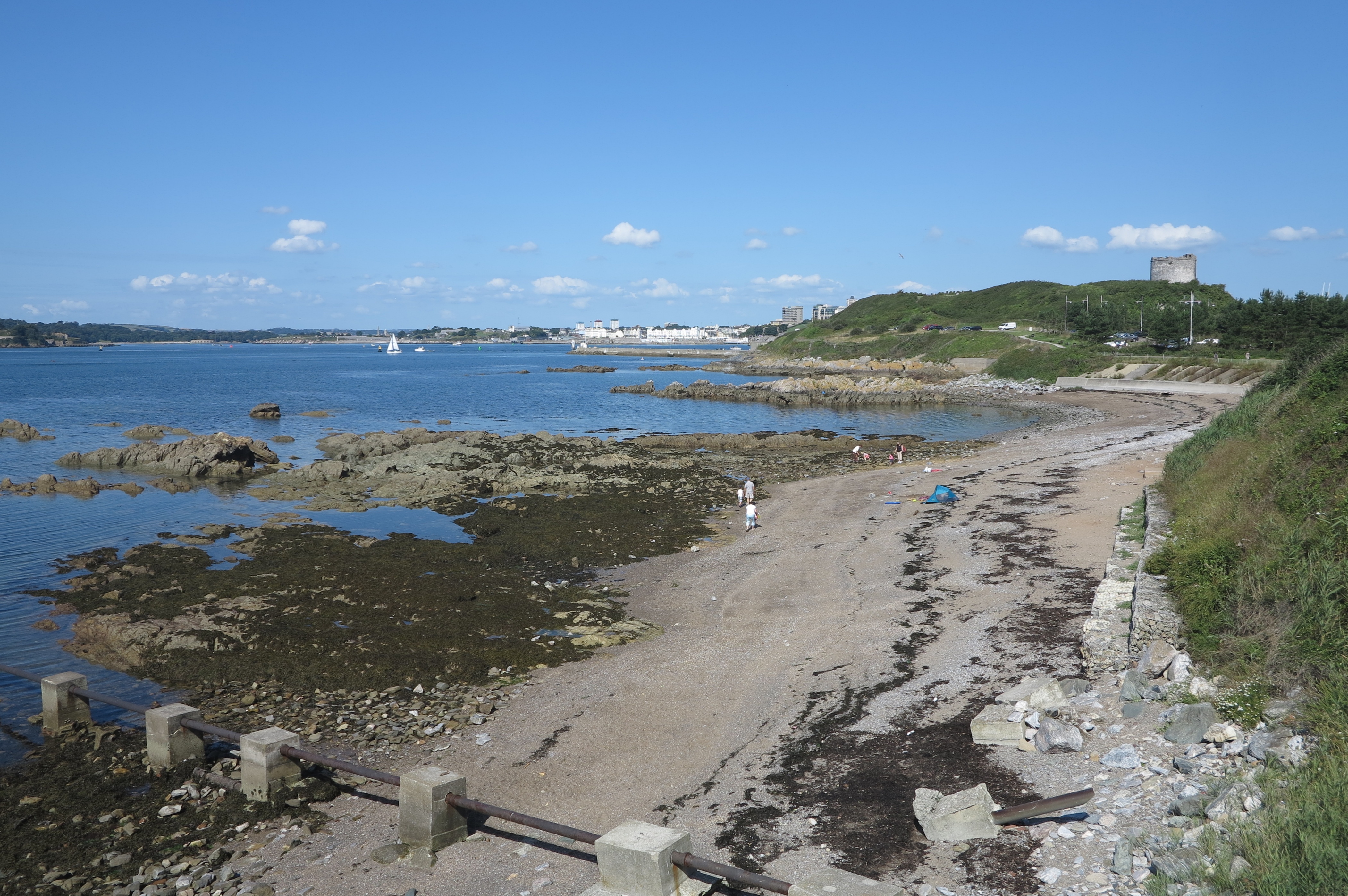 A view of Batten Bay Beach with Mountbatten Point and Mountbatten Tower in the distance